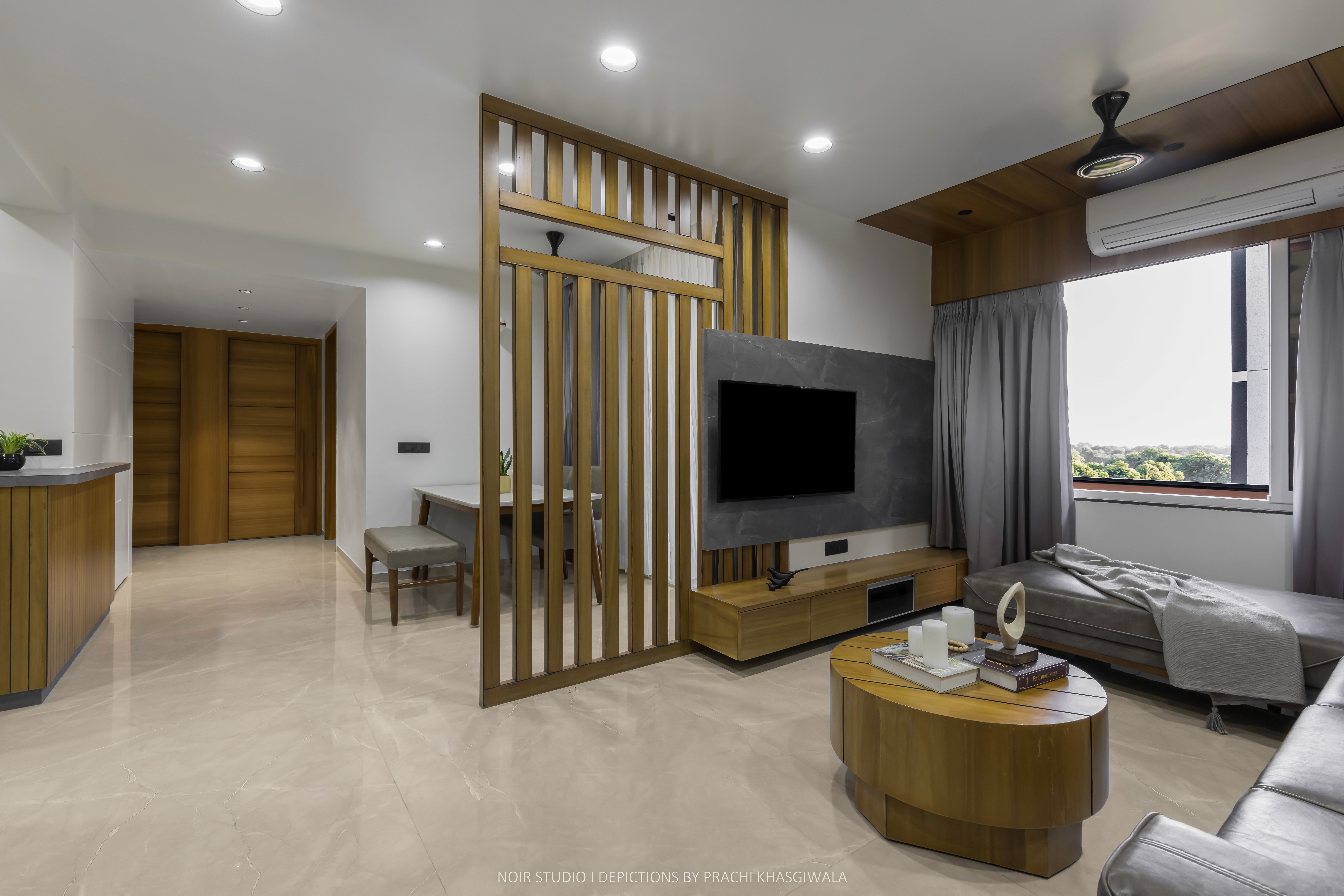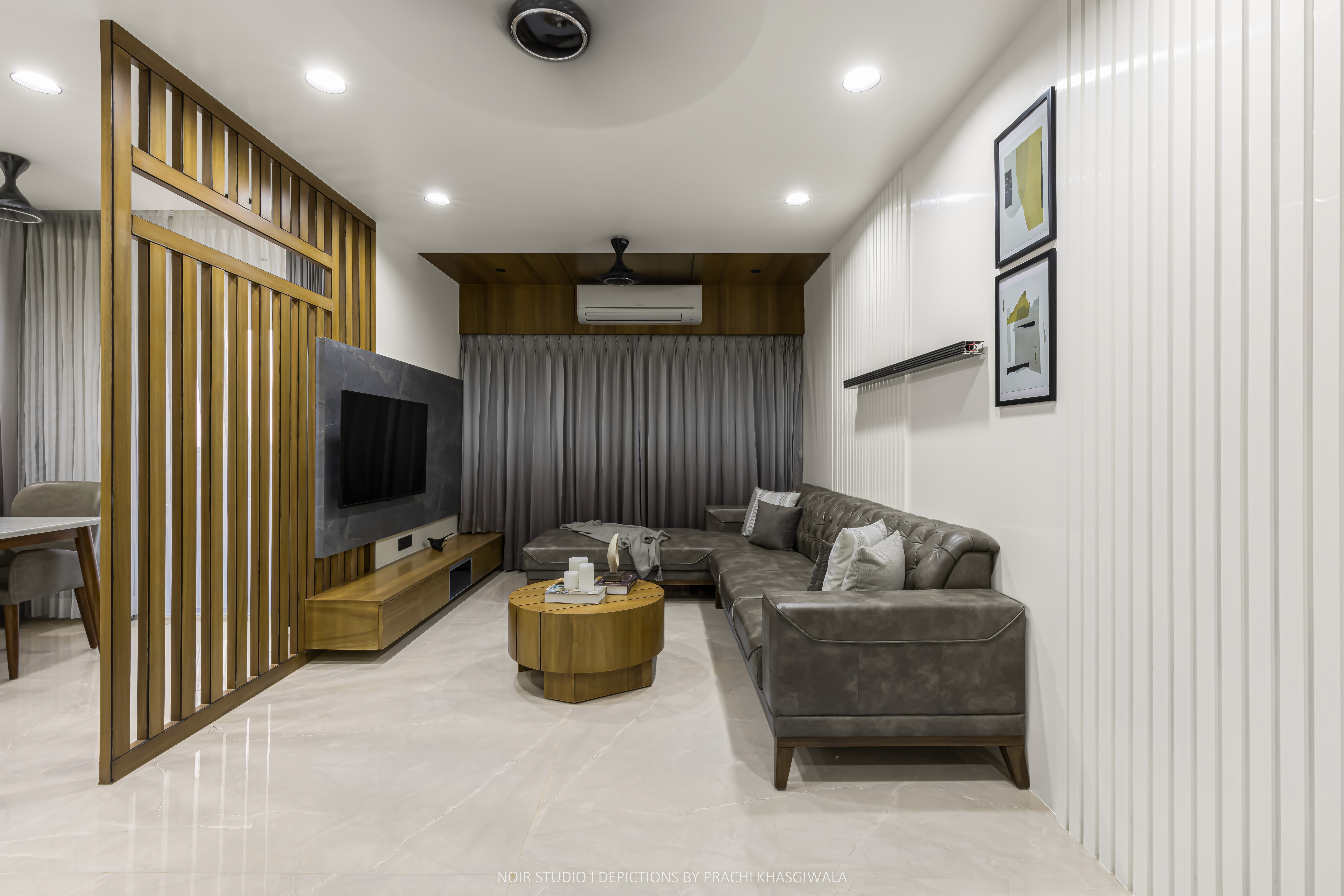 The living room is warm and cozy, wrapped in subtle tones that create a calm atmosphere anchored by a classic Chesterfield sofa that stands out as the room’s centerpiece. The kids’ bedroom features a custom bunk bed to optimize space, while the master bedroom is elevated with a bold headboard and smart hidden storage.
